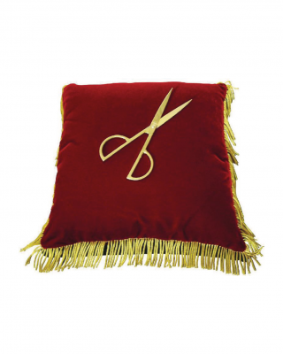 Ce coussin rouge avec des franges couleur or et sa paire de ciseaux dorés, seront parfait pour une soirée d'inauguration.