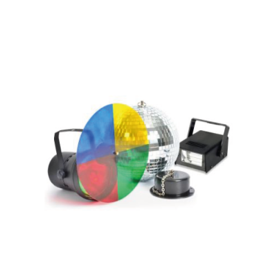 Ce set Disco Party remplit la pièce avec des changements continus de couleurs et une lumière brillante de stroboscope, il est parfait pour les soirées d'anniversaire ou les fêtes en offrant une atmosphère spécifique. Il est composé de : boule à facettes 20 cm, moteur 230 VAC, projecteur PAR36 avec roue de couleurs, lampe PAR36 e Adapté pour un montage au mur ou au plafond.